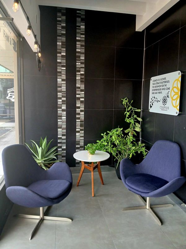 Available for comfortable laid back work or conversations. Includes modernJacobsen chairs, coffee table, plants and power for laptop connections. It can also be used for your own receptionist fully customizable for special accommodations. Inquire for a tour and application.